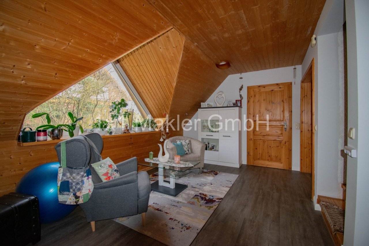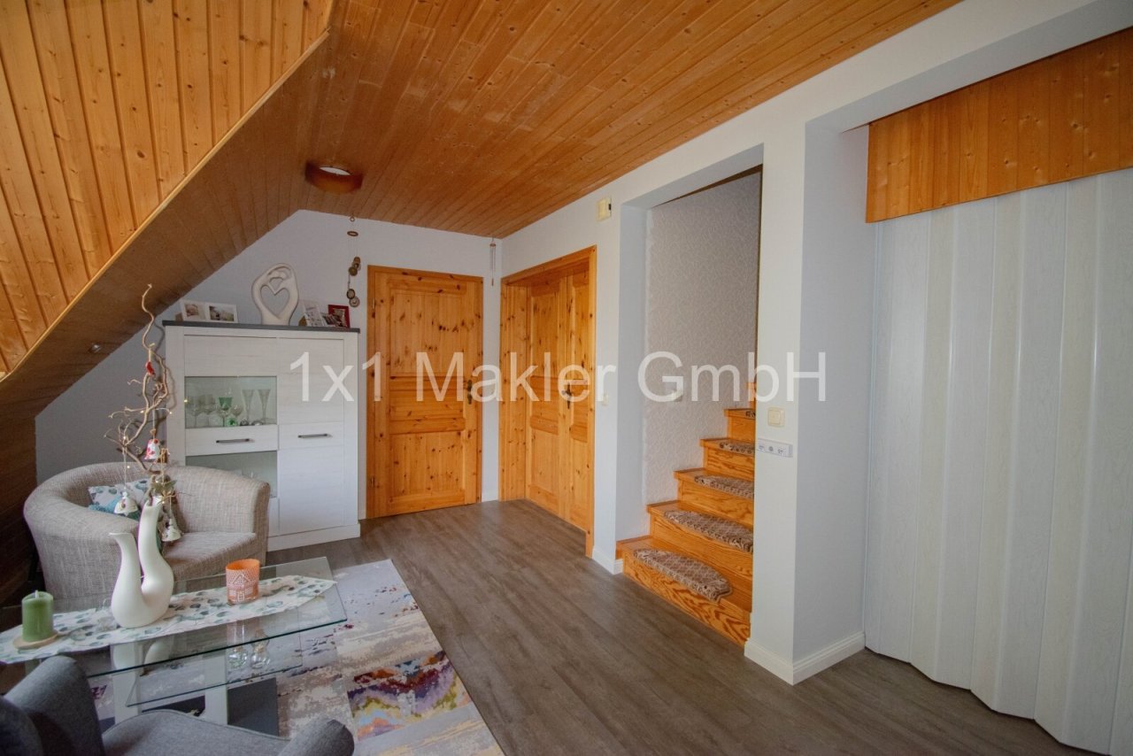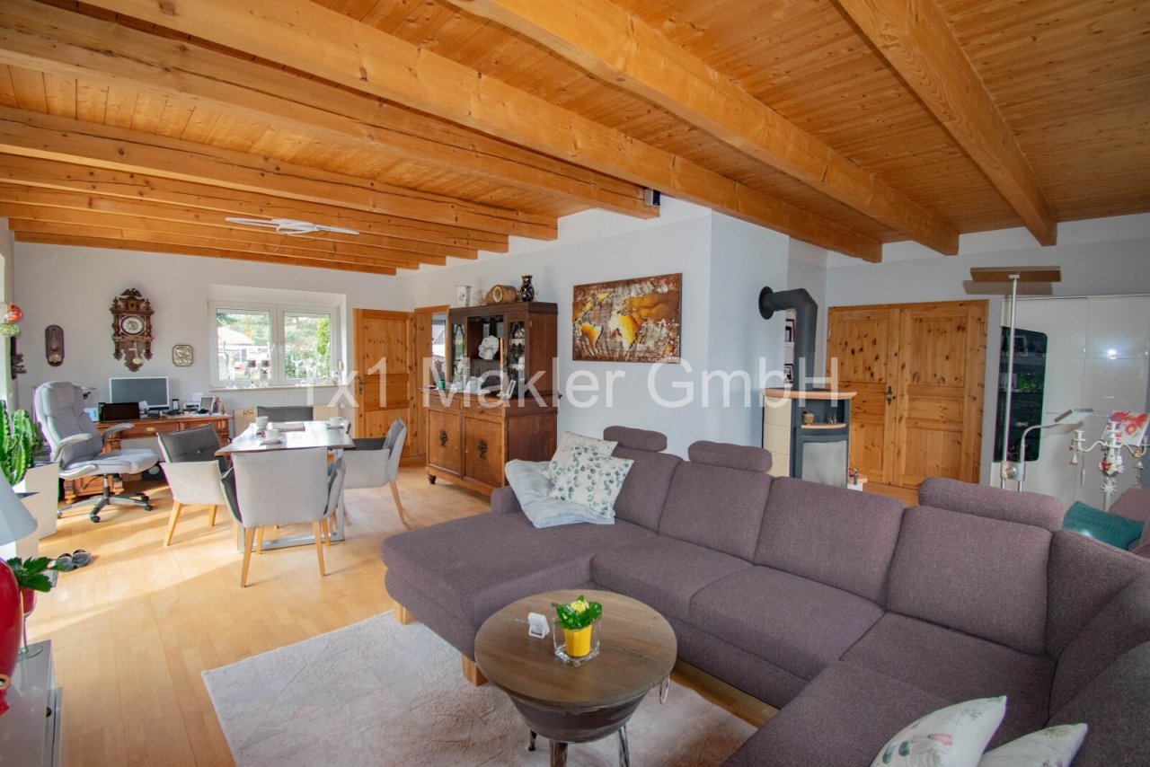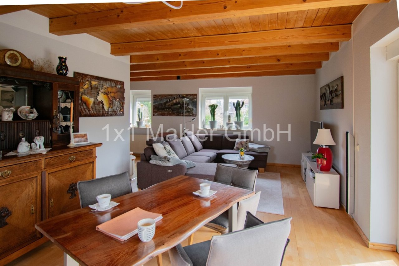 Bereits beim Betreten des Hauses entsteht ein angenehmes Wohngefühl: Der großzügige Wohn- und Essbereich mit sichtbaren Holzbalken schafft eine warme und einladende Atmosphäre. Große Fensterflächen sorgen für viel Tageslicht und bieten einen schönen Blick ins Grüne. Von hier aus gelangen Sie direkt auf die Terrasse, die zum Verweilen im Freien einlädt.